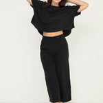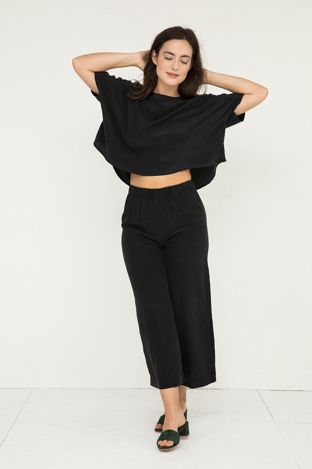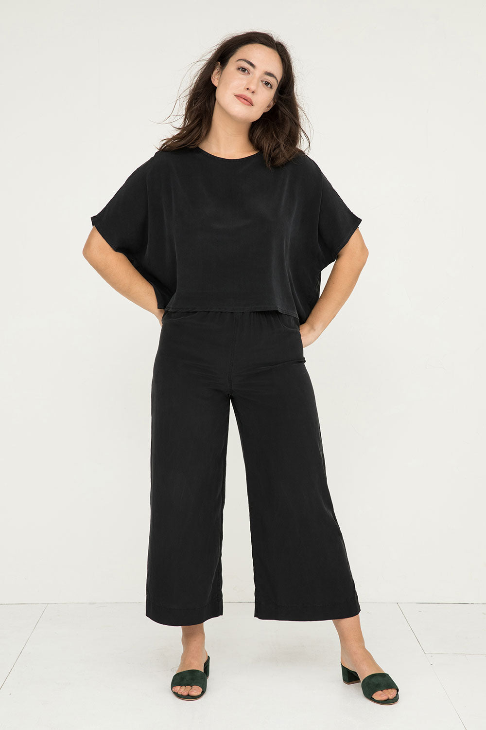 The Linn Tee is one of our simplest pieces, and sometimes simple is best. Structural cut lets the fabric do the heavy lifting–the beautiful folds and swing look right at home with pin-straight pants at a gallery opening, or over a gauzy dress on a sticky weekend afternoon.