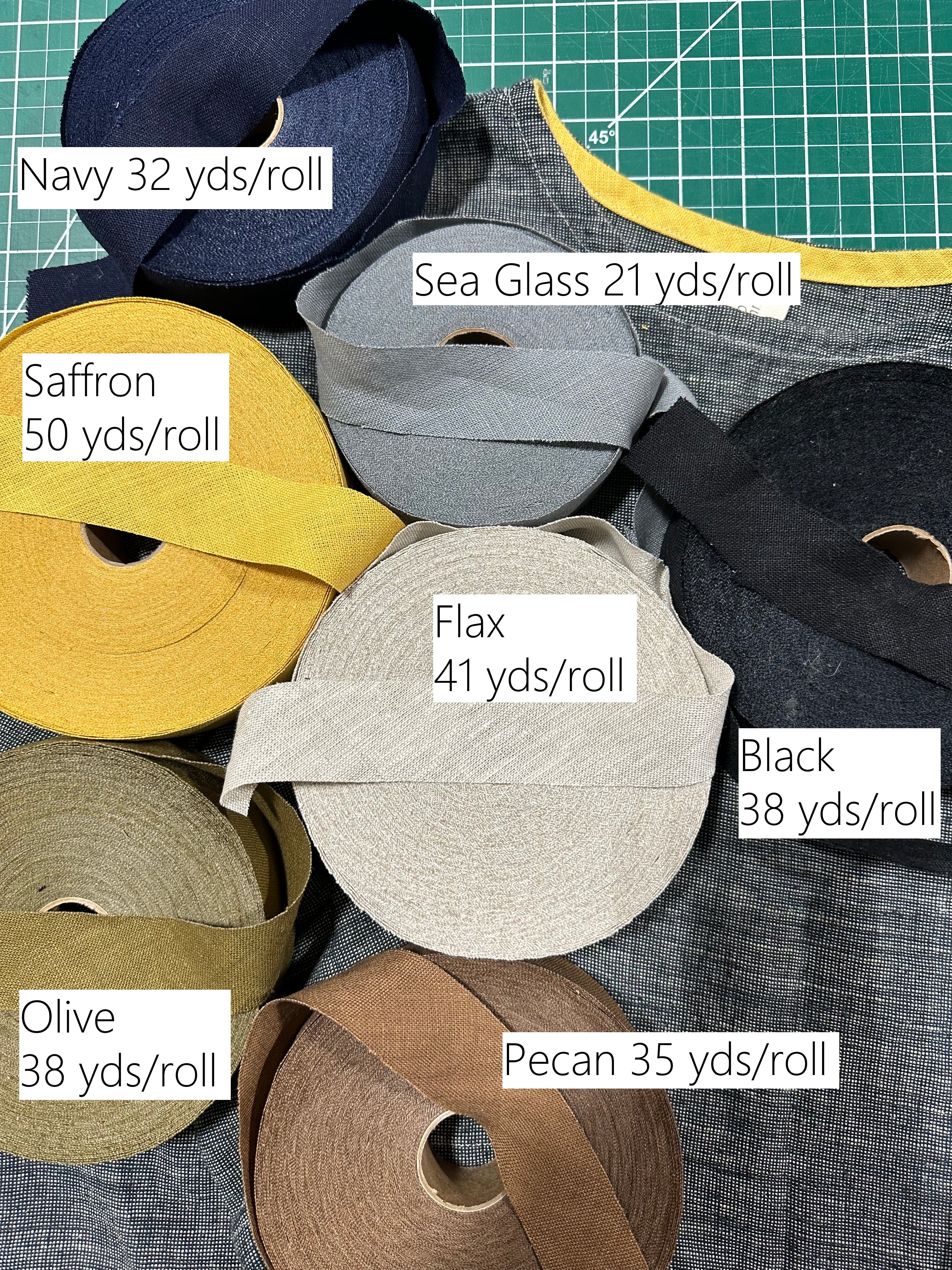 These are full rolls of 1 1/4" bias in our old Midweight Linen colors, we use this in production to finish all of our curved edges/openings like necklines, armholes, etc.