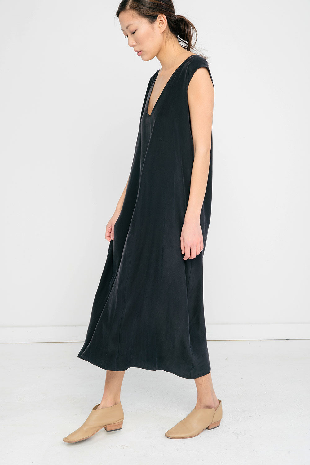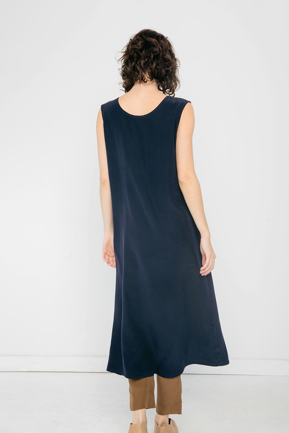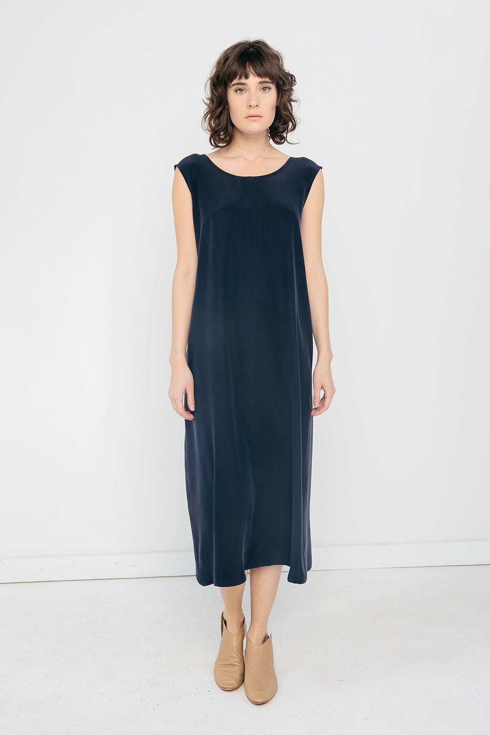 Versatile sleeveless silk midi dress that speaks for itself. The straight shift silhouette feels a bit 70s, but still timeless. Nothing unnecessary–just an effortless, flattering cut that hits mid-calf. It's right at home with sleek heels in a beautiful restaurant or with worn in birks at a roadside taco joint.