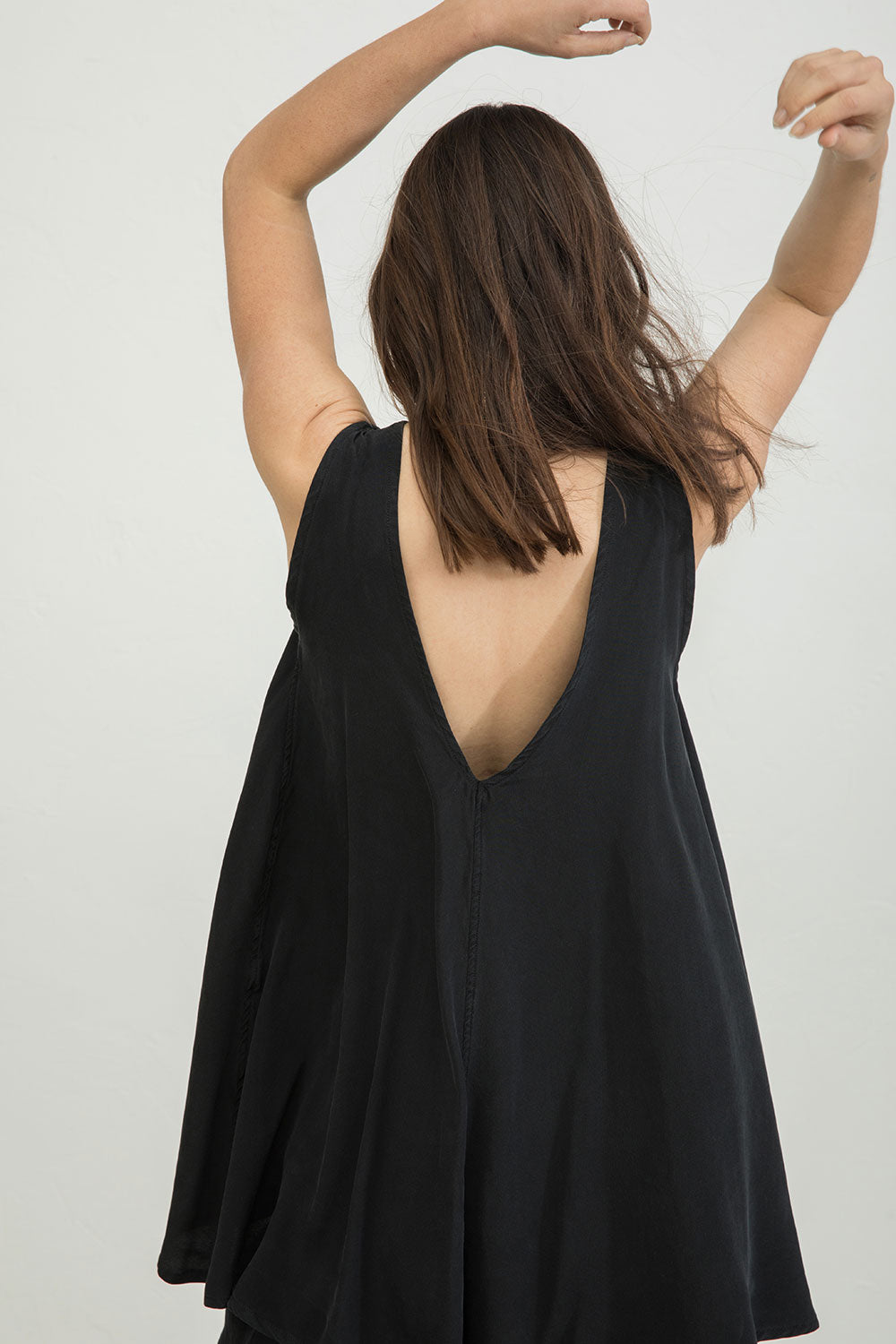 It has a simple but striking, sleeveless cut with low geometric armholes and billowing side panels. Its deep V back lets air in for ultimate comfort. The flattering, high-scoop neck and smartly-cut shoulders pair flawlessly with the dramatic trapeze shape. It hits around mid-thigh, providing coverage when you want, but you can also jaunt around sans pants at the beach or around the house.