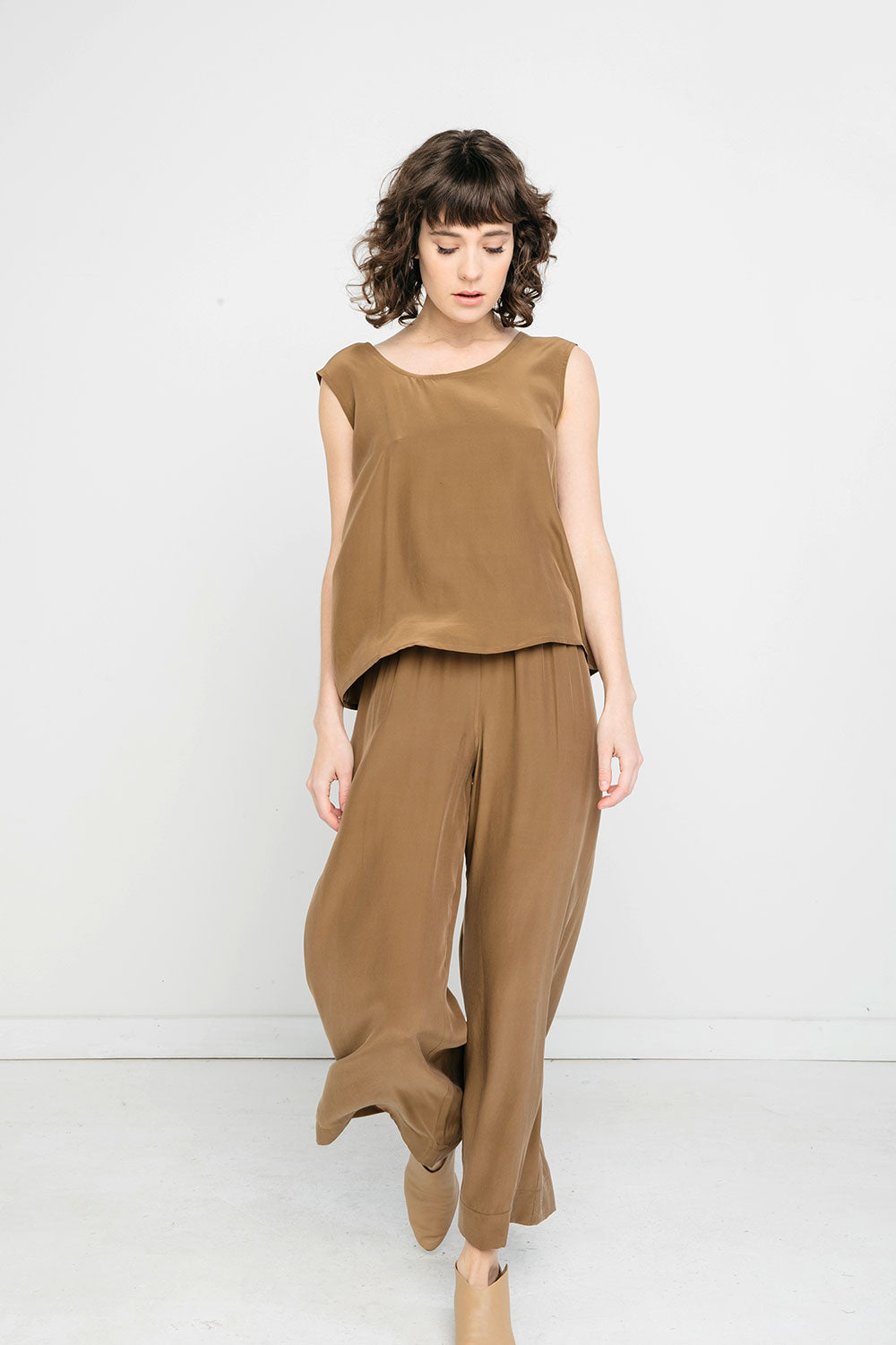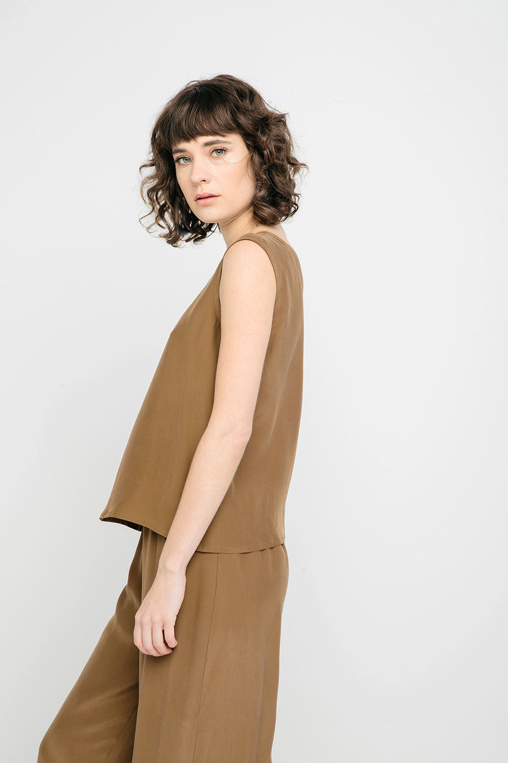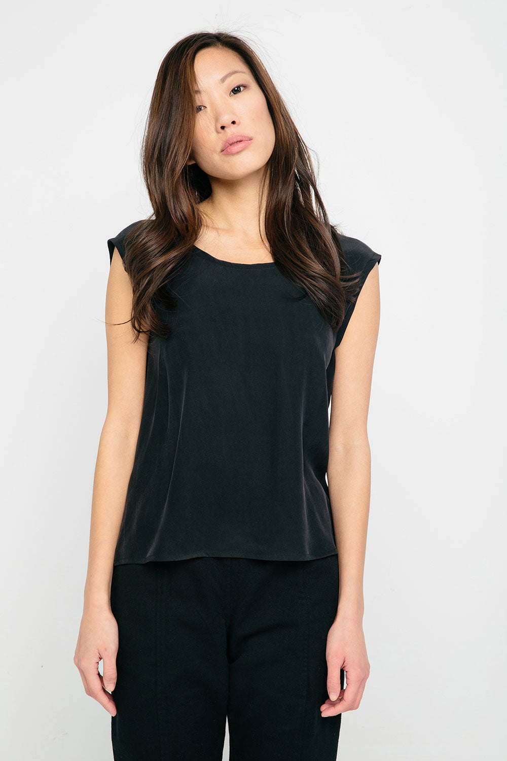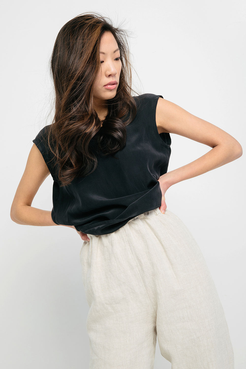 A simple sleeveless silk tank–the one you’ve been looking for. Minimal cut recalls those perfect silk shells from the 90s, but with a subtle a-line shape so it doesn't pull at the hips like those thrifted ones often do.