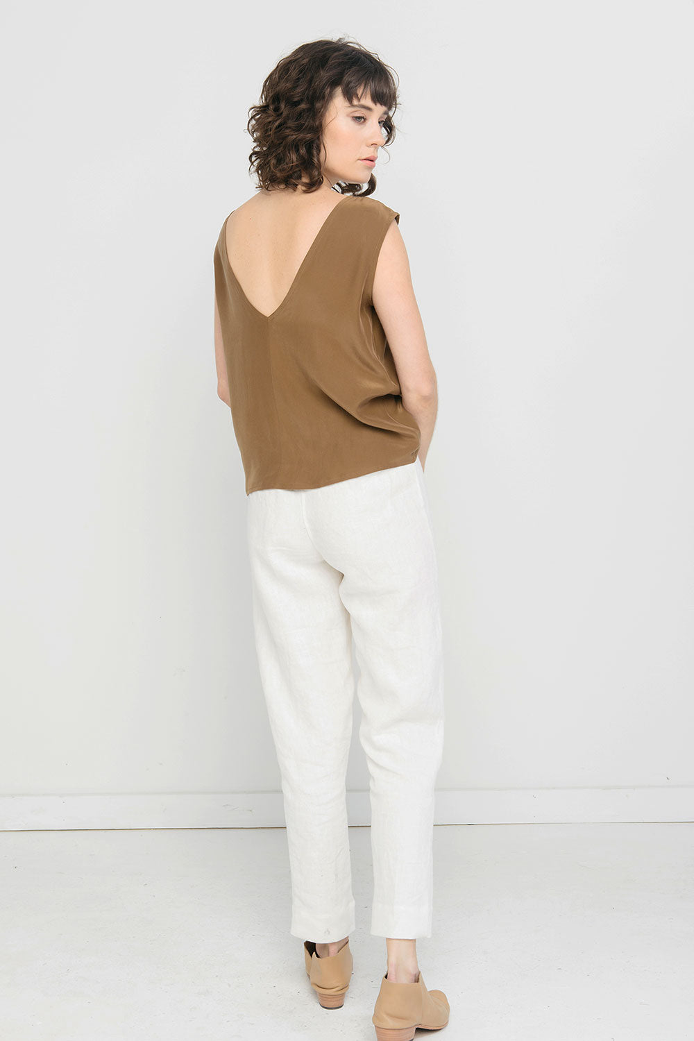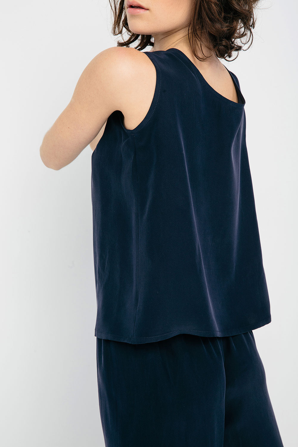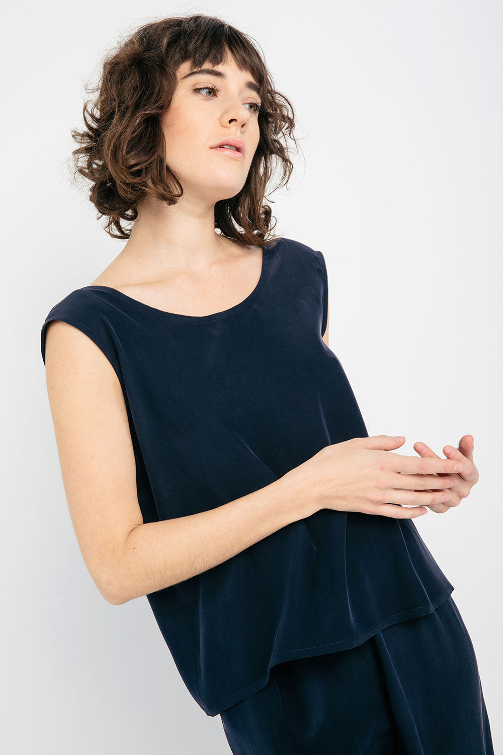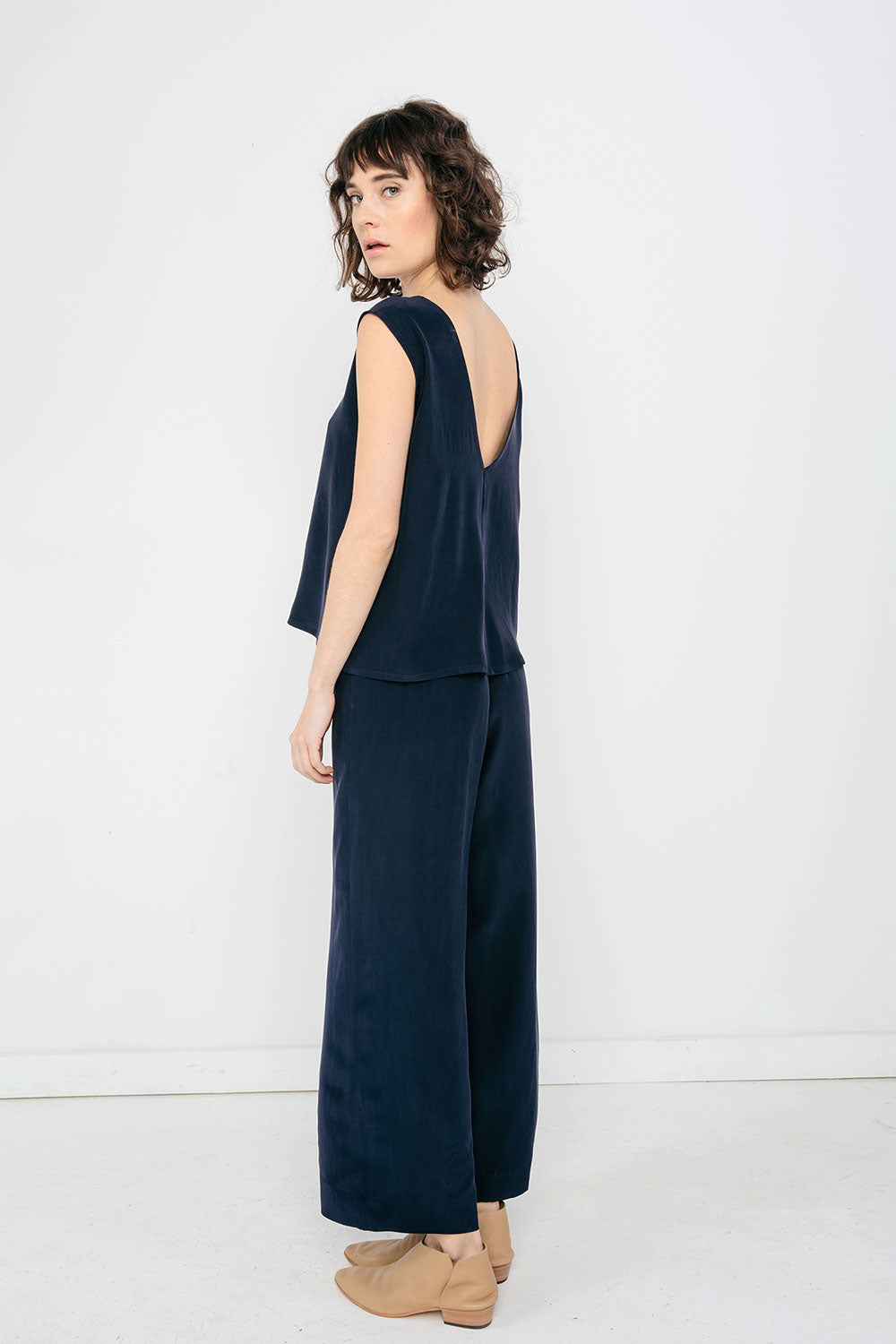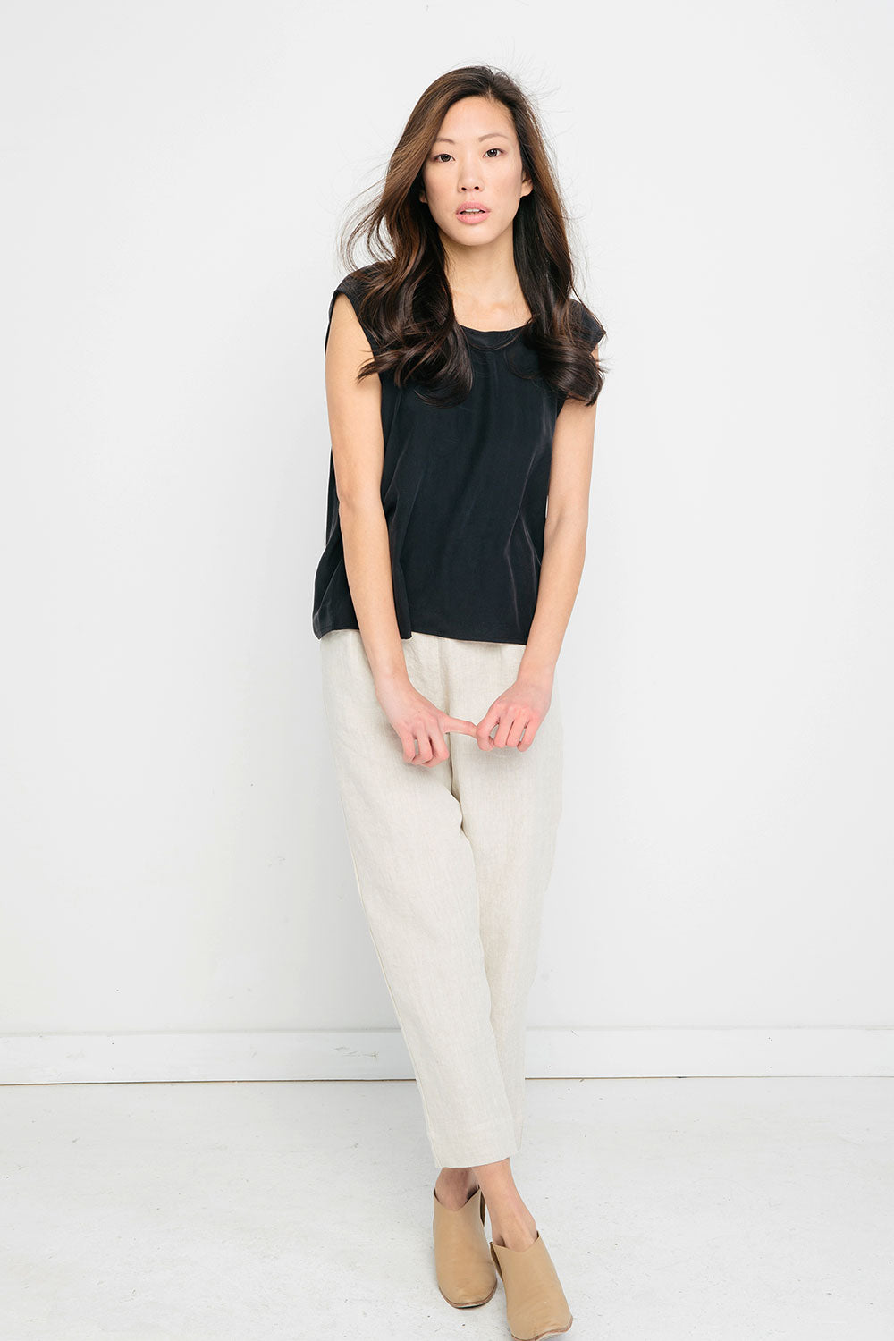 A simple sleeveless silk tank–the one you’ve been looking for. Minimal cut recalls those perfect silk shells from the 90s, but with a subtle a-line shape so it doesn't pull at the hips like those thrifted ones often do.