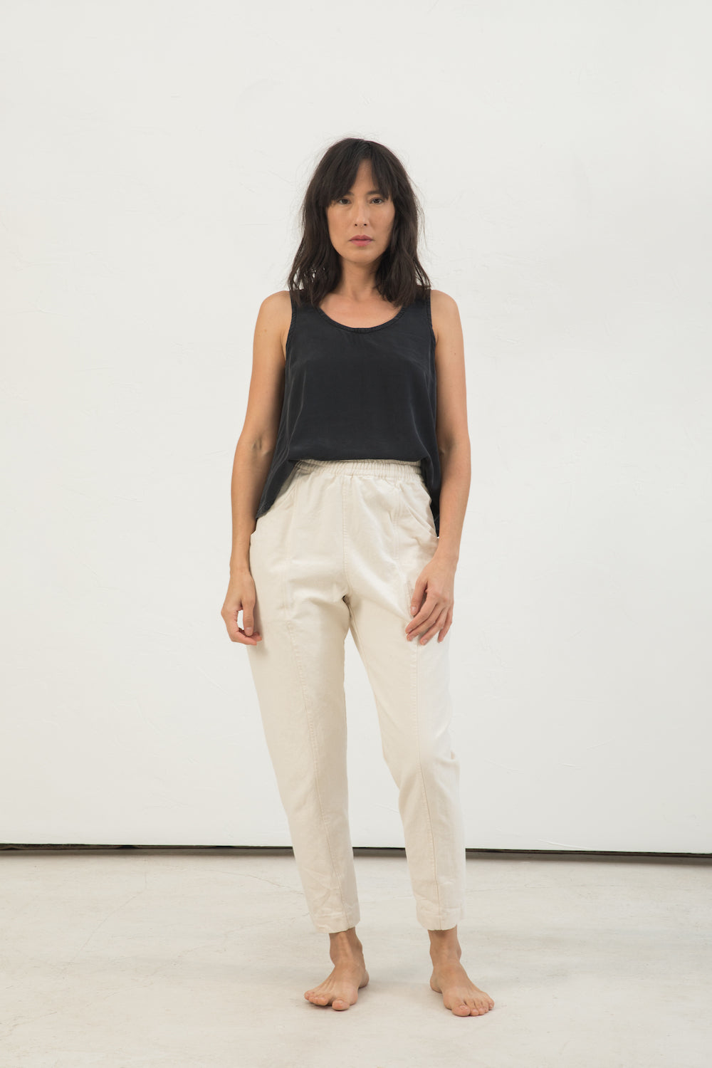 Recomendamos telas de peso medio y sin elasticidad. El lino, el algodón, el cáñamo, los tejidos lisos o la lona funcionarán bien. Las telas más livianas agregarán más caída y las telas más pesadas darán como resultado una prenda más estructurada. Asegúrese de que cualquier material que elija pueda aguantar en el área del bolsillo.