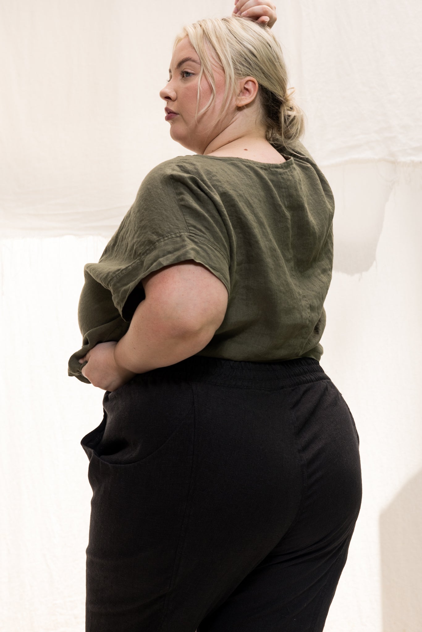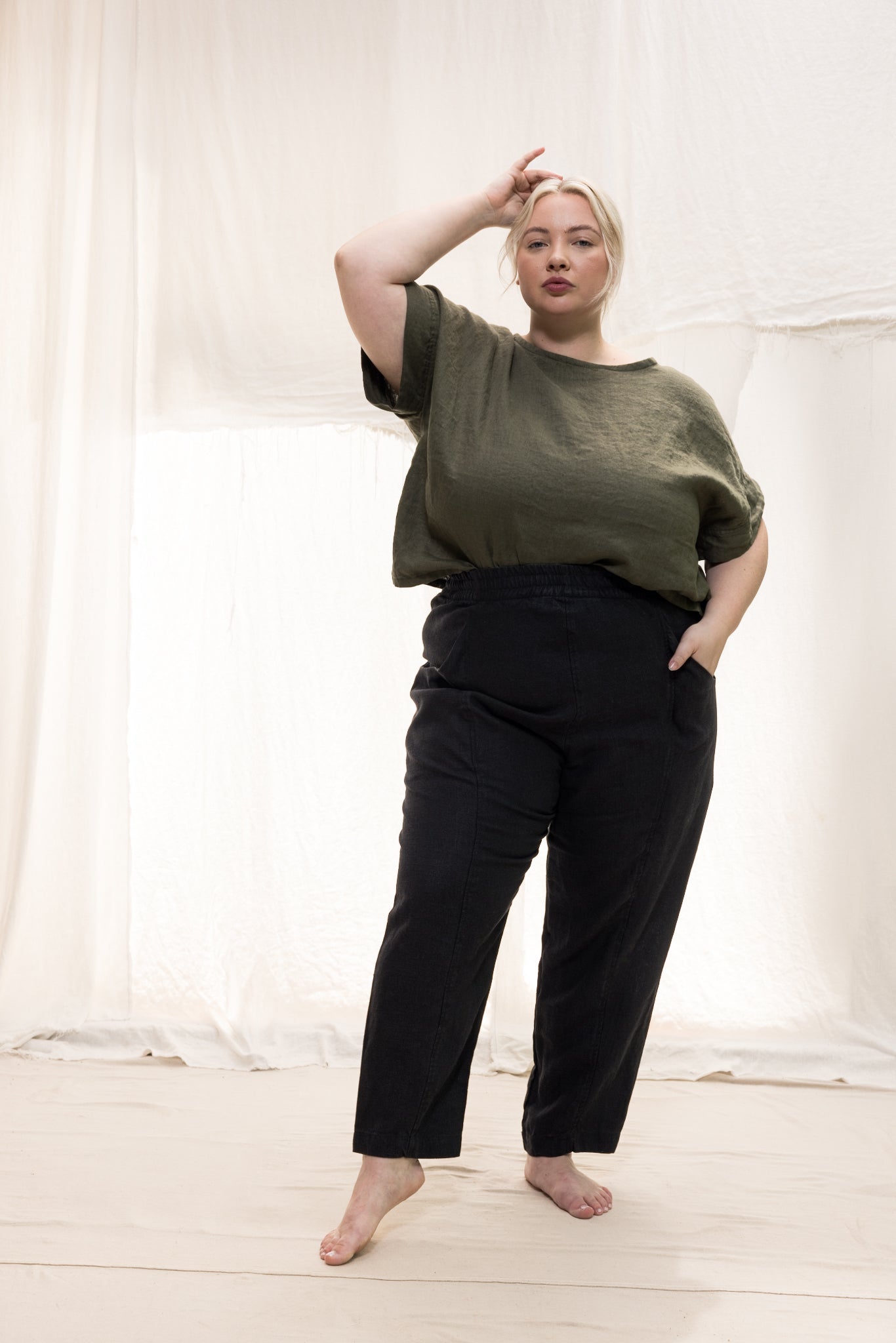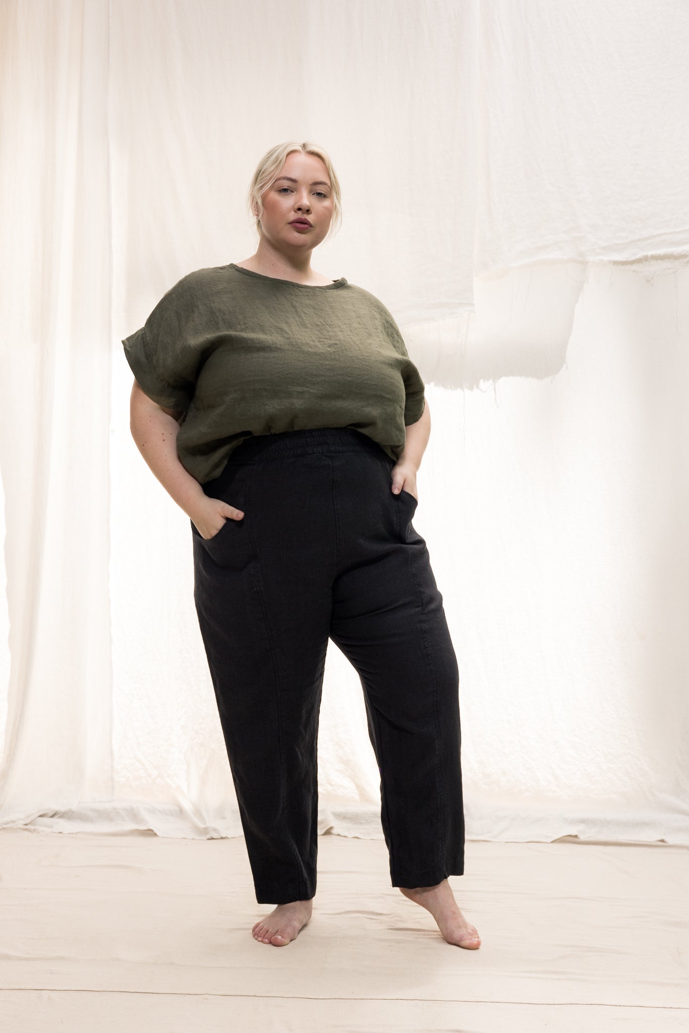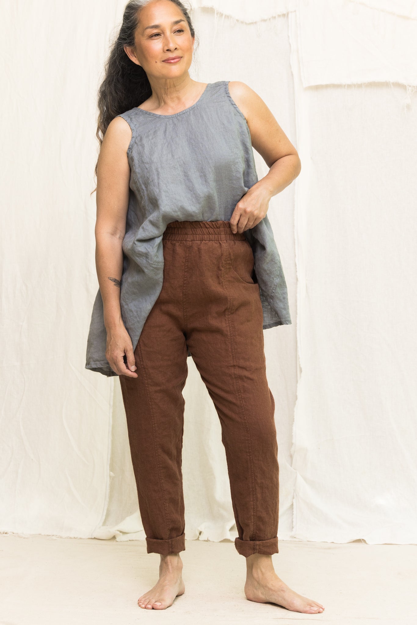 In our Midweight Linen, these are relaxed and luxurious. They truly feel like pants you can do anything in. Try them for hosting an elegant party (sleek Ink with a washed black silk top, done and done), and the next day, you can tackle a home renovation project (I definitely store nails in my Clyde pockets, but do so at your own risk).